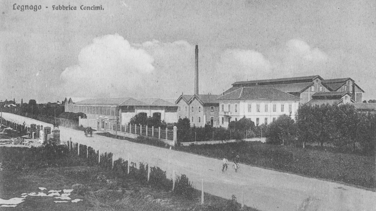 L’ultima decade dell’800 è caratterizzata dal dinamismo dell’Associazione Agraria del Basso Veronese. Dopo la nascita dello zuccherificio che consente di tessere una rete di alleanze economiche e politiche di notevole rilevanza per la città di Legnago, lo sbocco naturale dei numerosi progressi nel comparto agronomico e in particolare della diffusione delle nuove pratiche di fertilizzazione artificiale, porta alla creazione, nel 1901, di una fabbrica per la produzione di concimi chimici e solfato di rame. Il sito del nuovo grande stabilimento viene individuato, ancora una volta, presso l’area della antica spianata, alle porte della città, in direzione ovest. Esattamente di fronte al neonato zuccherificio, sul lato opposto alla grande strada che porta a Cerea. La vicinanza della stazione ferroviaria e del corso del fiume Bussè rendono il sito adeguato alle esigenze industriali. La «Società Anonima Agricola Veronese», questo il nome del sodalizio che gestisce la fabbrica, attira nel giro di poco tempo numerosi capitali anche esterni all’area della pianura veronese. Nel volgere di qualche mese diviene evidente che attorno alla nuova realtà industriale si stanno coagulando gli interessi economici della grande proprietà agricola. Anche per questo motivo l’idea iniziale di realizzare una fabbrica cooperativa viene accantonata in favore della costituzione di una società anonima che offre maggiori garanzie per gli investimenti economici. Nel 1907, il tentativo compiuto dall’Associazione agraria di trasformare la «Veronese» in una cooperativa per venire maggiormente incontro alle necessità economiche della piccola proprietà, fallisce miseramente. I soci dell’Agraria, dunque, rivolgono altrove i propri sforzi riuscendo, nel giro di poco più di un anno, a realizzare lo stabilimento di Cerea, condotto non a caso in forma cooperativa. La “Veronese” continua la propria produzione, in concorrenza con il vicino stabilimento cereano, negli anni non mancheranno i momenti di scontro e di tensione. Nel 1928 la fabbrica legnaghese viene assorbita dal colosso Montecatini. Nel corso della Seconda guerra mondiale subisce danni notevoli, come attestano le cronache di Maria Fioroni, a causa sia dei bombardamenti Alleati sia delle devastazioni compiute dai tedeschi in ritirata. Il complesso industriale rimane attivo fino agli anni Sessanta. È ancora visibile oggi il Silos Parabolico ex Montecatini realizzato nel 1954-1955.